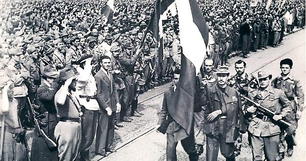 Partigiani sfilano in piazza Vittorio Veneto a Torino