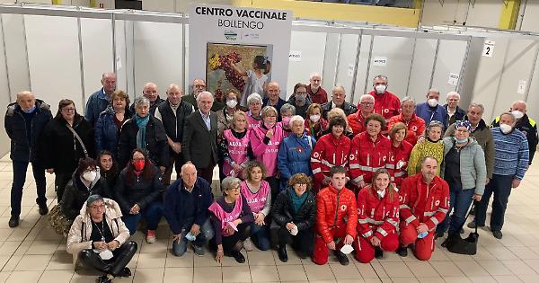Tutti i volontari insieme al sindaco Ricca al brindisi nell'hub vaccinale di Bollengo