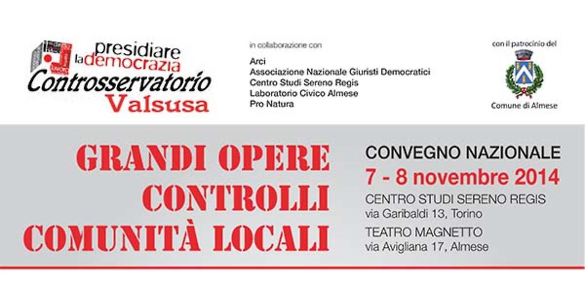 Il “Controsservatorio Valsusa”, in collaborazione con Arci, Associazione nazionale Giuristi democratici, Centro studi Sereno Regis, Laboratorio civico Almese, Pro Natura, e con il patrocinio del Comune di Almese, organizza un convegno nei giorni 7 e 8 novembre per affrontare l’attualissima tematica del rapporto fra Grandi opere e Comunità locali, con particolare attenzione all’aspetto dei controlli.