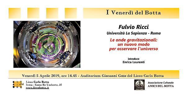 Venerdì 5 aprile 2019 alle ore 14:45 presso l’auditorium “Giovanni Getto” del Liceo Carlo Botta, in corso Re Umberto, 37 a Ivrea, il professor Fulvio Ricci dell’Università “La Sapienza” di Roma, parlerà delle onde gravitazionali: un nuovo modo per osservare l’universo. Il docente universitario sarà introdotto da Enrica Laurenti insegnante presso il Liceo Carlo Botta.