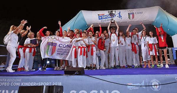 Il Piemonte è il vincitore della quinta edizione del Trofeo CONI Kinder+Sport. I ragazzi del Presidente Gianfranco Porqueddu, con 110 punti totali, hanno avuto la meglio sui padroni di casa dell’Emilia Romagna (108) e sul Lazio (107), diventando così il primo comitato regionale del CONI ad aver vinto due edizioni (l’altra fu Lignano Sabbiadoro 2015) del trofeo multisport dedicato ai giovani atleti under 14 che quest’anno ha riunito a Rimini e in altri 12 comuni limitrofi circa 3200 ragazze e ragazzi provenienti da 21 Regioni e Province autonome (foto Simone Ferraro).Ma a fare festa sono anche i 10 atleti scelti dal comitato provinciale di Trento per partecipare al TEM, il Test di Efficienza Motoria sviluppato dall’Istituto di Medicina e Scienza dello Sport del CONI insieme alla Direzione Territorio e Promozione del Comitato Olimpico Italiano per raccogliere i dati sulle capacità e abilità motorie dei ragazzi. I trentini, infatti, hanno totalizzato il punteggio maggiore e tra due settimane, grazie a Kinder+Sport, title sponsor della manifestazione, voleranno a Buenos Aires per assistere ai Giochi Olimpici Giovanili e sostenere la squadra azzurra. Sono questi i verdetti del Trofeo CONI Kinder+Sport 2018 che, come da prassi, si è chiuso con una cerimonia show andata in scena nel Parco Fellini di Rimini, caratterizzata dai classici fuochi d’artificio e animata da un campione come Carlton Myers che da questa terra è arrivato a primeggiare con l’Italbasket, diventando anche l’alfiere azzurro ai Giochi Olimpici di Sydney 2000. Presenti in piazza tante delle delegazioni in gara con un lungo applauso che ha accolto quella ligure quando ha dedicato le proprie medaglie alla vittime del crollo del ponte di Genova. In rappresentanza del CONI i membri di Giunta Nello Talento e Sergio d’Antoni che hanno premiato la delegazione vincitrice. Mentre Cecilia d’Angelo, responsabile Territorio e Promozione del CONI, e Max Castiglia di Kinder+Sport hanno premiato la delegazione trentina che volerà in Argentina. A fare gli onori di casa sono stati il Presidente del CONI Emilia Romagna, Umberto Suprani e l’Assessore allo Sport di Rimini, Gian Luca Brasini. “Tutti gli sforzi fatti sono ripagati dalla presenza di migliaia di sportivi piccoli grandi come voi – le parole di Suprani -, così come avvenuto per la cerimonia di apertura. La forza dello sport è questa, la gioventù come la vostra. Continuate a praticarlo e il futuro dello sport italiano è assicurato”. “Questa sera si celebrano i vincitori – ha sottolineato Brasini -, ed è giusto premiare chi vince se lo ha fatto meritando il rispetto di tutti e rispettando le regole. In questa cerimonia finale si premiano i vincitori è anche l’occasione per fare festa per chi non ha vinto. Non bisogna mai mollare. È giusto che si giochi sempre per vincere ma è dalla sconfitte che si impara, si migliora e si diventa un campione. Grazie a tutti voi, viva lo sport”.