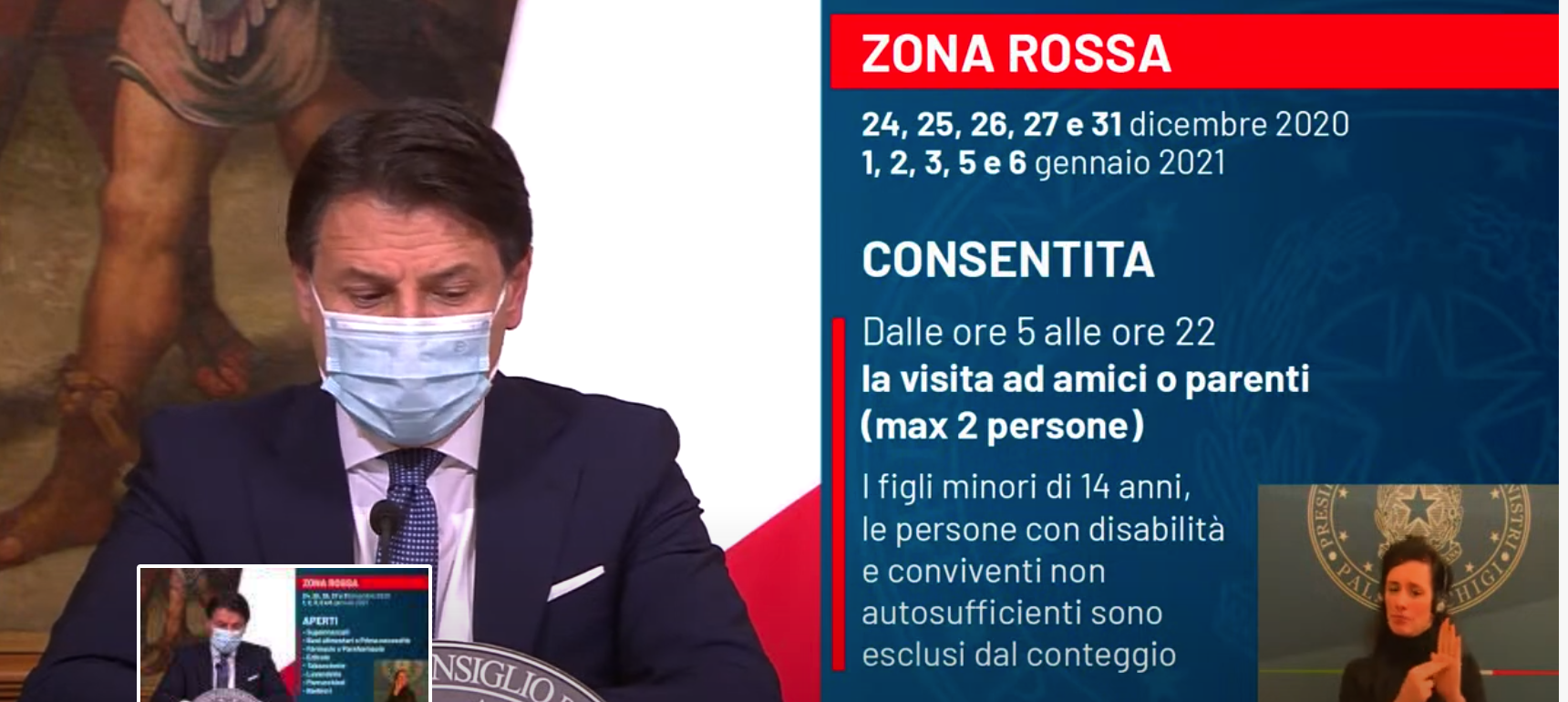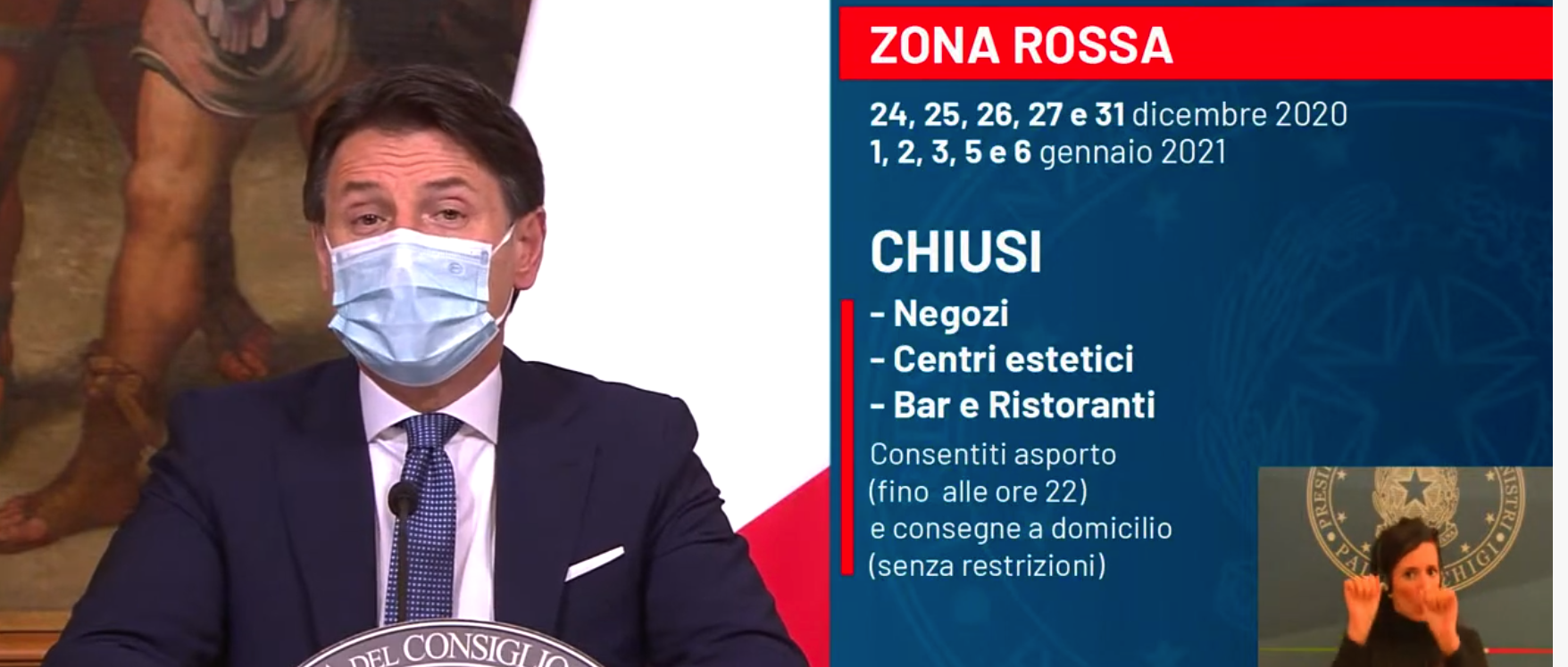 Arriva il decreto di Natale: l'Italia sarà rossa per tutti i festivi e prefestivi fino alla Befana, con i negozi, i bar e i ristoranti chiusi e il divieto di uscire da casa propria se non per motivi di lavoro e salute. Dopo giorni di discussioni, il governo vara la nuova stretta per evitare che i pranzi e le cene delle feste facciano da detonatore per una terza ondata a gennaio e febbraio. "La situazione rimane difficile, il virus si lascia piegare ma non sconfiggere. Dobbiamo intervenire e vi assicuro che è una decisione non facile e sofferta" dice il premier Giuseppe Conte sottolineando come la stretta sia il frutto della "preoccupazione" degli scienziati per la risalita della curva.
