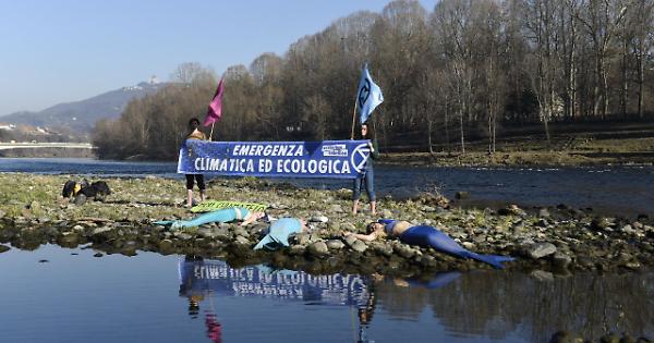 Torino. Attiviste vestite da sirene mettono in “scena” una performace sulle rive del Po per sensibilizzare sul lungo periodo di siccità che la regione Piemonte sta affrontando a causa della crisi climatica. Alcune attiviste di Extinction Rebellion si sono vestite da sirene simulandone la morte e lo spiaggiamento nelle secche del Po. L’azione, dal grande impatto visivo, mira a mostrare gli effetti già in atto della crisi climatica ed ecologica. Le attiviste spiegano che la scelta di impersonificare le sirene ha un significato metaforico: l’essere mitologico, infatti, simboleggia tutto ciò che apparentemente non è strettamente necessario per la sopravvivenza umana, come l’arte, la fantasia e i sogni, e ai quali si dovrà rinunciare in un mondo devastato da catastrofi naturali e scarsità di materie prime, prima fra tutte l’acqua.