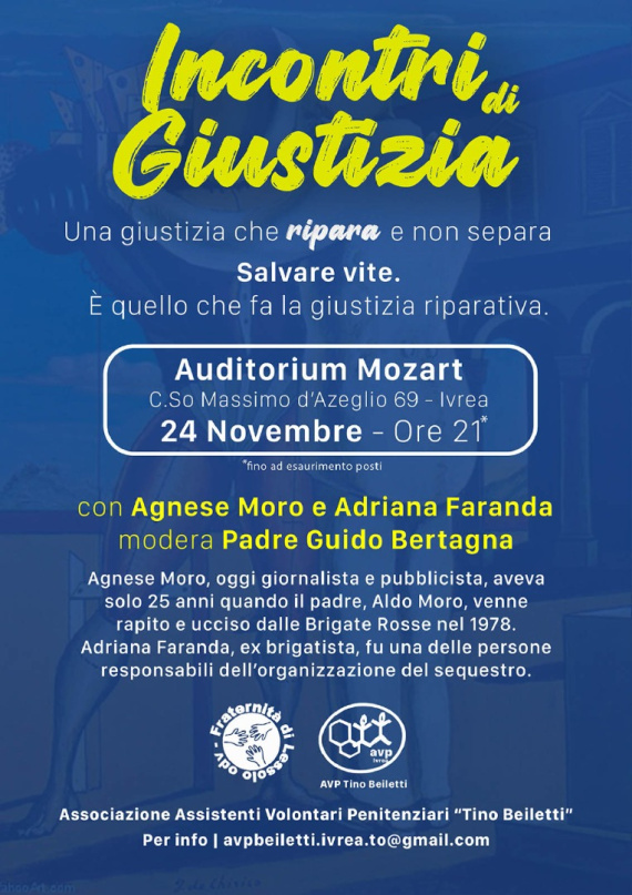L’evento è organizzato per sostenere la cultura e il lavoro di chi opera perché si affermi, anche nel nostro Paese, come richiesto dall’UE e dal buon senso, una Giustizia che si prenda maggior cura delle vittime e non escluda un possibile volontario contributo da parte del colpevole, alla riparazione della lacerazione prodotta.