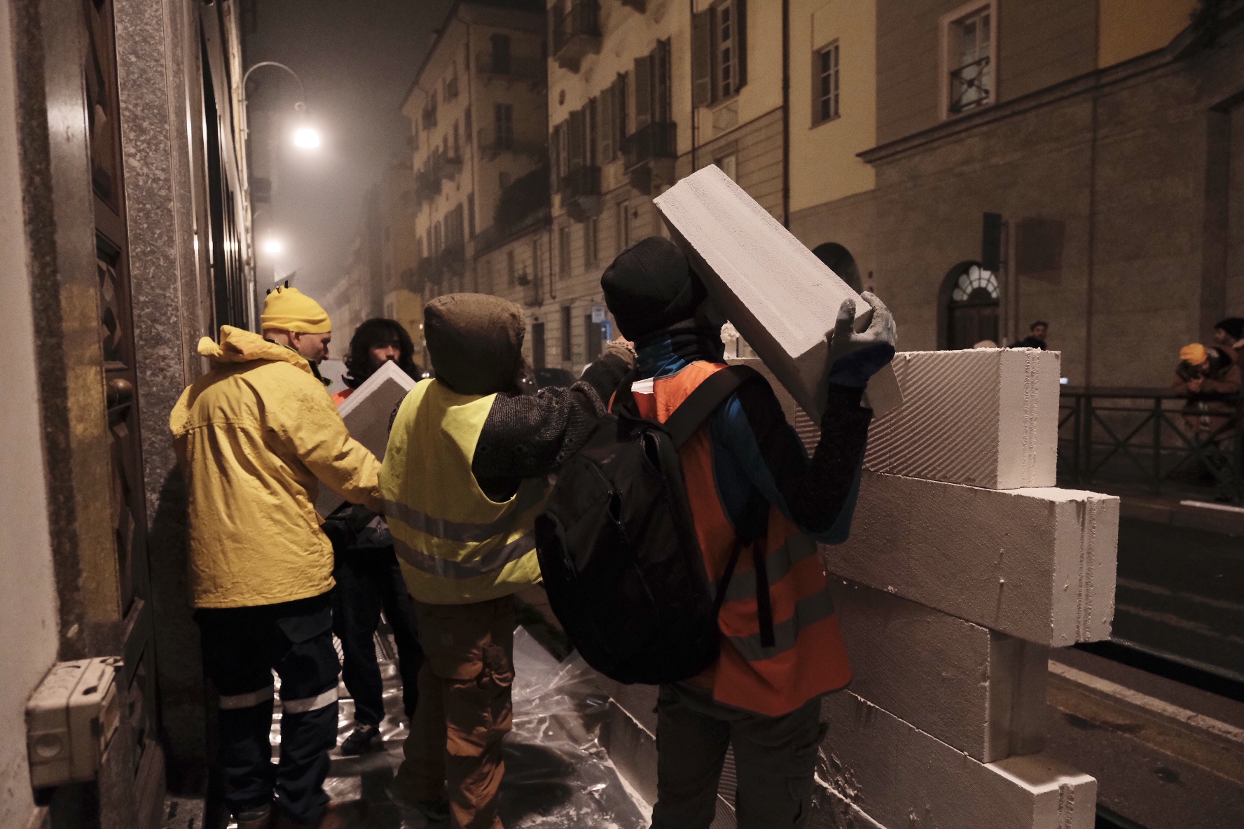 Il muro riporta la scritta: "Crisi climatica. Chiuso per inadempienza", in segno di protesta con le politiche ambientali della Regione Piemonte. Gli attivisti si sono poi seduti sul marciapiede ad attendere l'arrivo dei funzionari e delle forze dell'ordine.