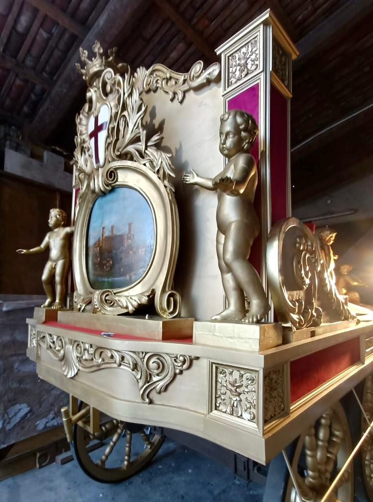 “Abbiamo studiato la struttura originaria, che di fatto era una via di mezzo tra le fattispecie più comuni di carro con pianale (agricolo) e carrozza, e abbiamo cercato di capire quanto potessimo allontanarci e quanto invece rimanere fedeli alla struttura originaria, nel rispetto delle normative vigenti in termini di circolazione e sicurezza. La soluzione adottata è una struttura con pianale, piuttosto fedele alla tradizione ma con alcuni elementi di novità, su tutte le due facce (fronte e retro) con roll-bar incorporato e cinture di sicurezza, fino ai nuovi elementi decorativi e i cosiddetti riccioli” nella parte bassa del carro, ma anche gli schienali per i paggetti. Alcuni elementi del cocchio originale, come il leone o la seduta della Mugnaia, sono stati ripresi dall’originale”