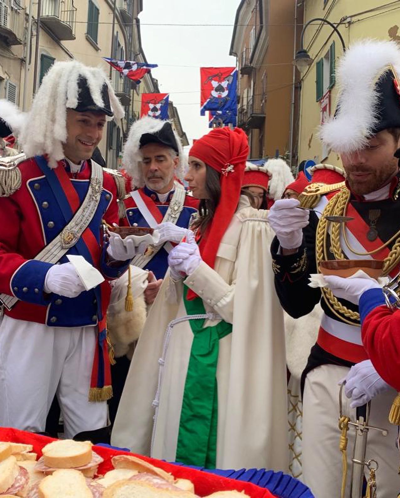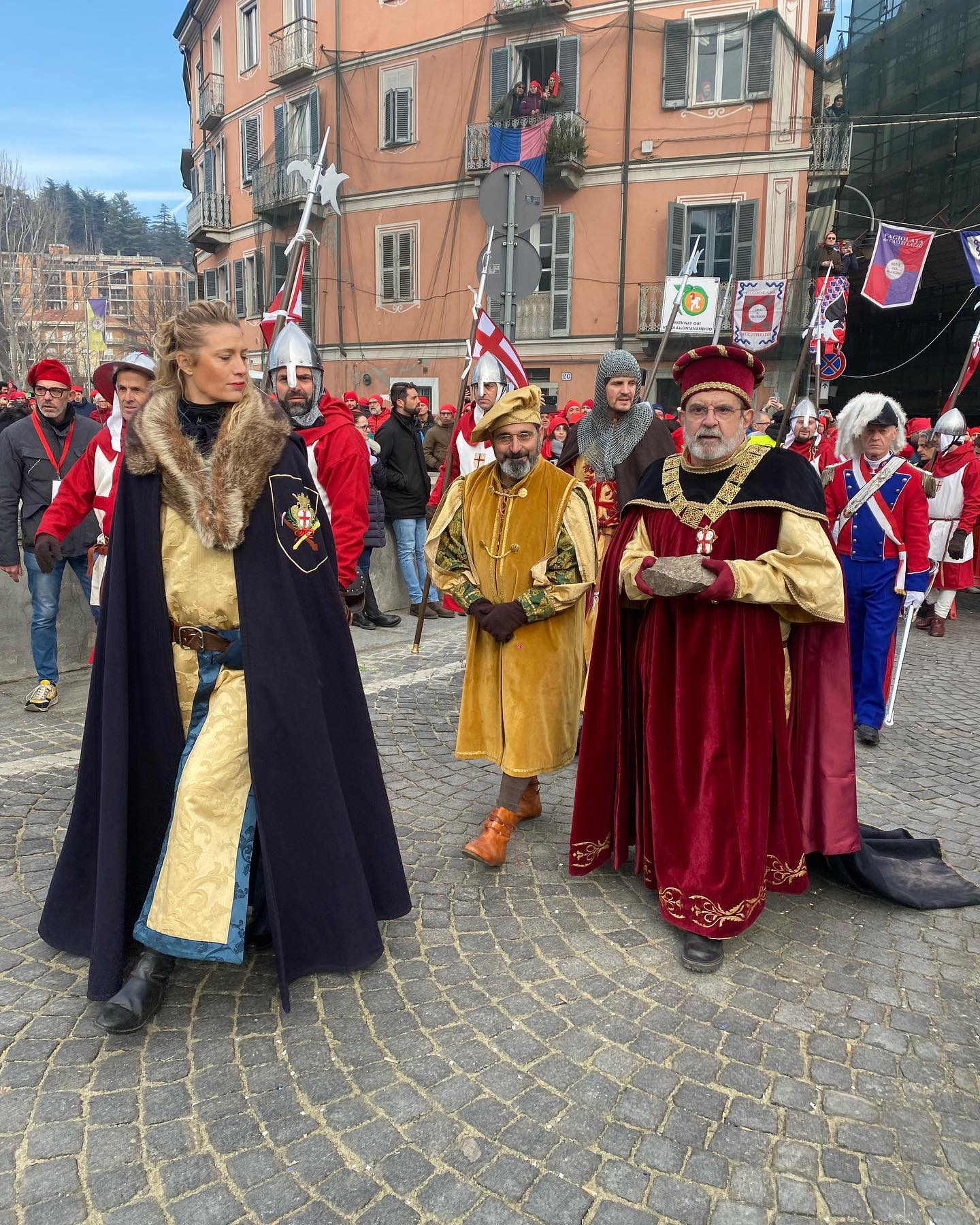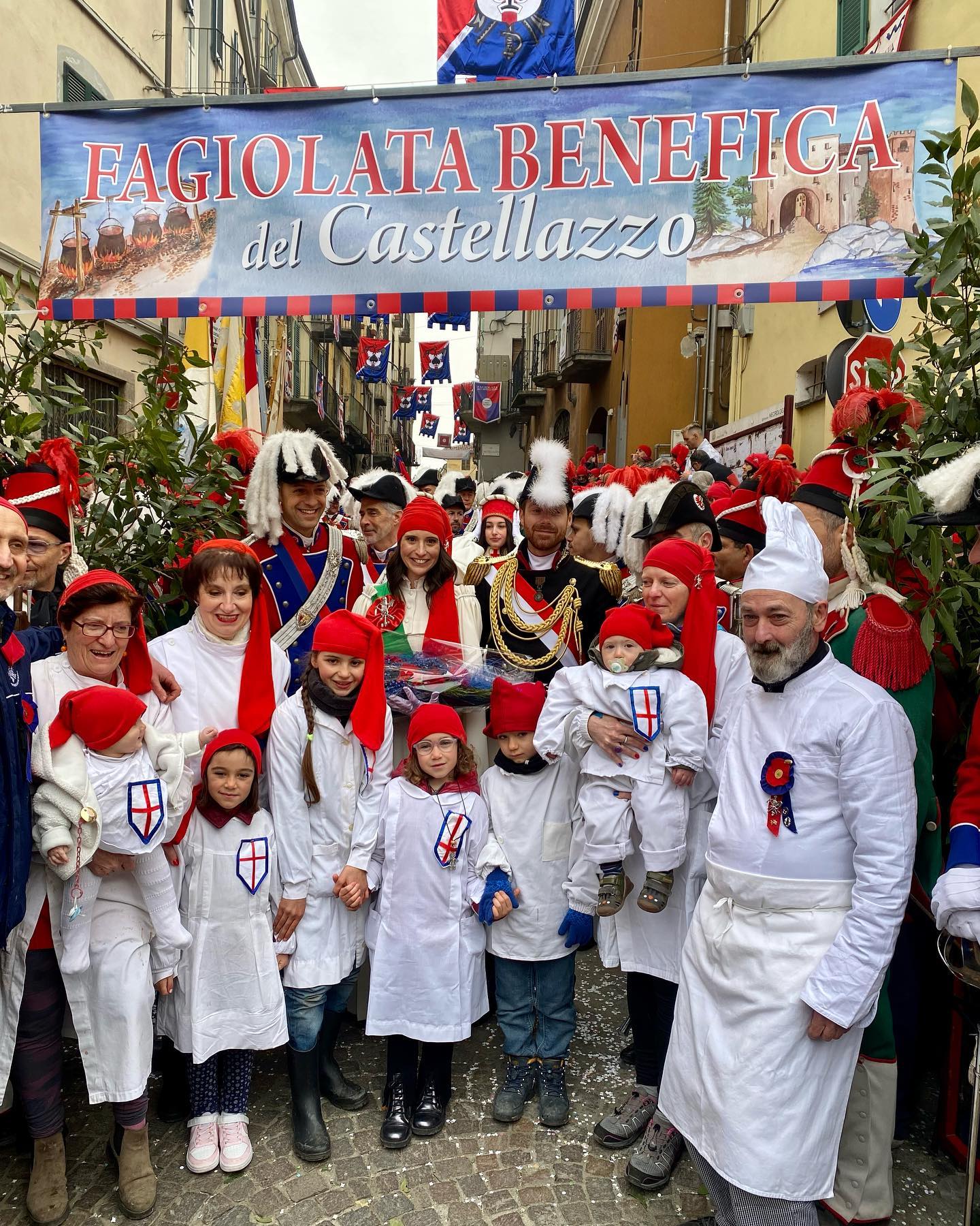 Visita della Mugnaia e del Generale alla Fagiolata Benefica del Castellazzo in piazza Maretta. Generale , Mugnaia e il loro seguito fanno visita alla fagiolata per il rituale assaggio dei fagioli e per l’inizio della distribuzione delle razioni benefiche. Il Podestà al Castellazzo scalza la pietra per la Preda in Dora dai ruderi del Castellazzo con l’antico martello d’arme.