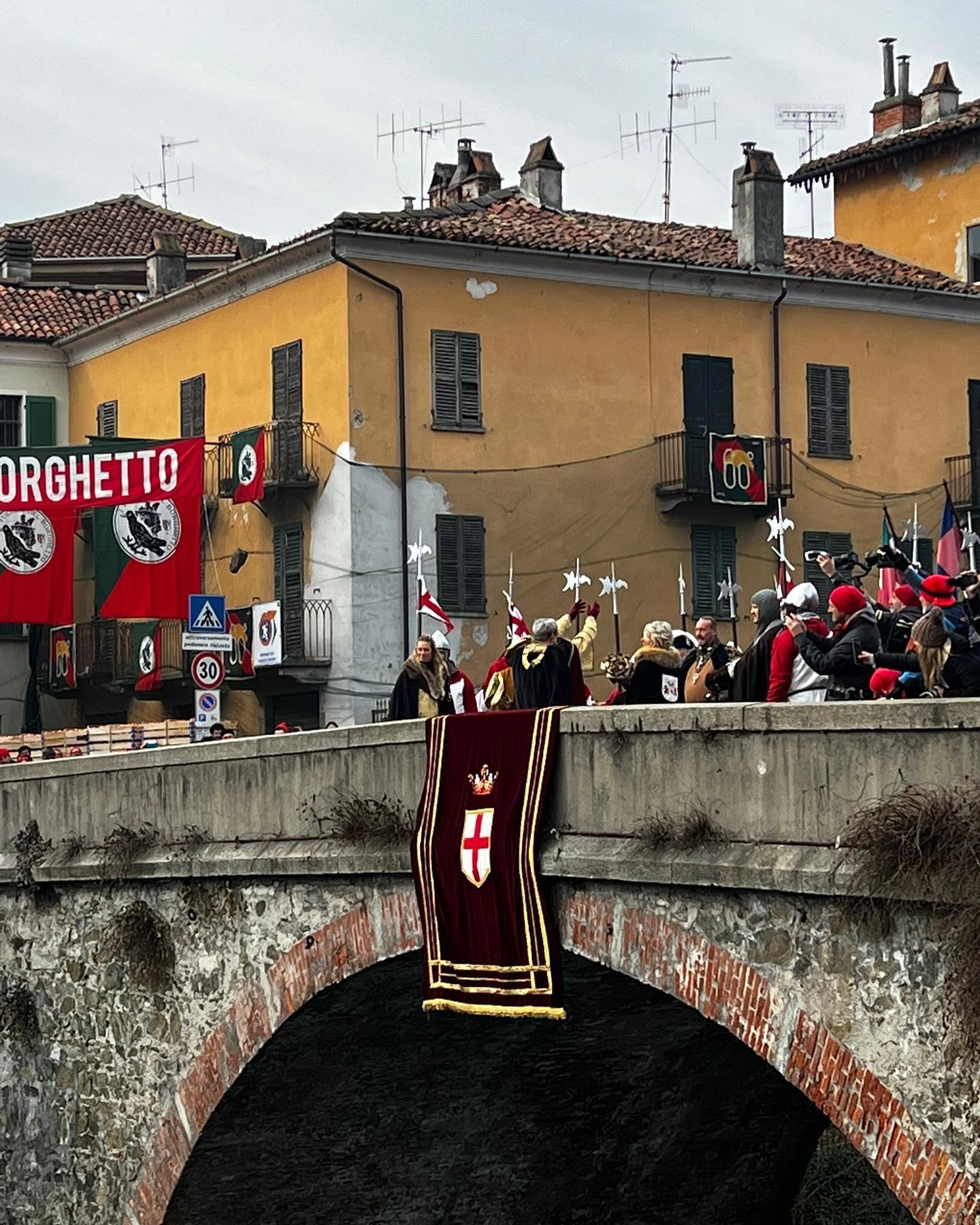 Il Podestà con il suo seguito e i Credendari, accompagnato dagli Alfieri e dai Pifferi e Tamburi, volgendo le spalle al parapetto del ponte, getta dietro di sé verso valle la pietra tratta dal Castellazzo pronunciando la frase “Hoc facimus in spretum olim Marchionis Montisferrati, nec permittemus aliquod aedificium fieri ubi erant turres domini Marchionis” (facciamo questo in dispregio del Marchese del Monferrato, né permetteremo che alcun edificio abbia a sorgere dove erano le torri del signor Marchese) in segno di rifiuto di ogni forma di tirannia.