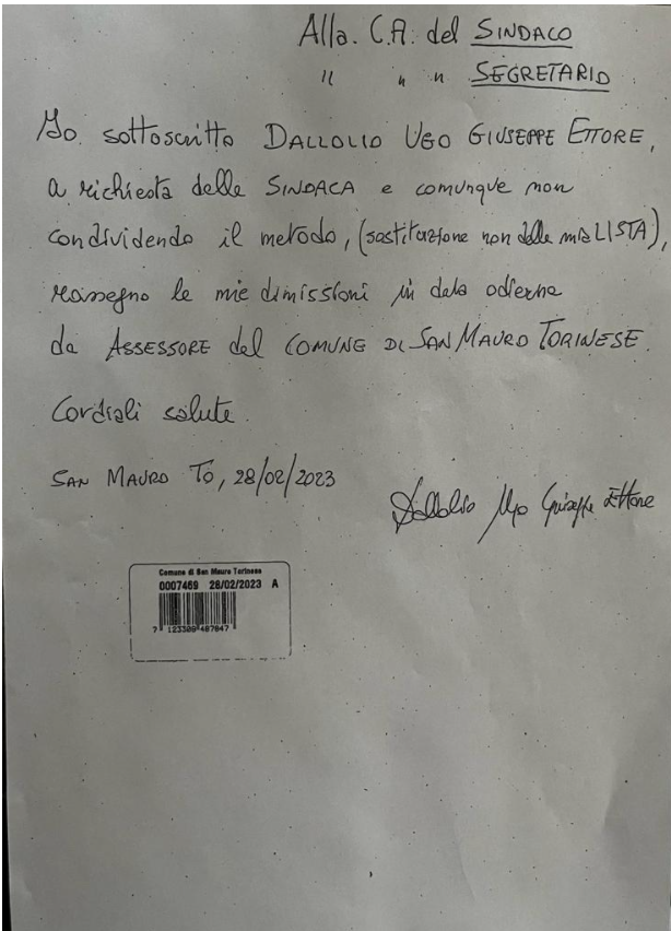 "Io sottoscritto - leggiamo - Dallolio Ugo Giuseppe Ettore su richiesta della Sindaca e comunque non condividendo il metodo (sostituzione non dalla mia lista) rassegno le mie dimissioni in data odierna da assessore del Comune di San Mauro Torinese".