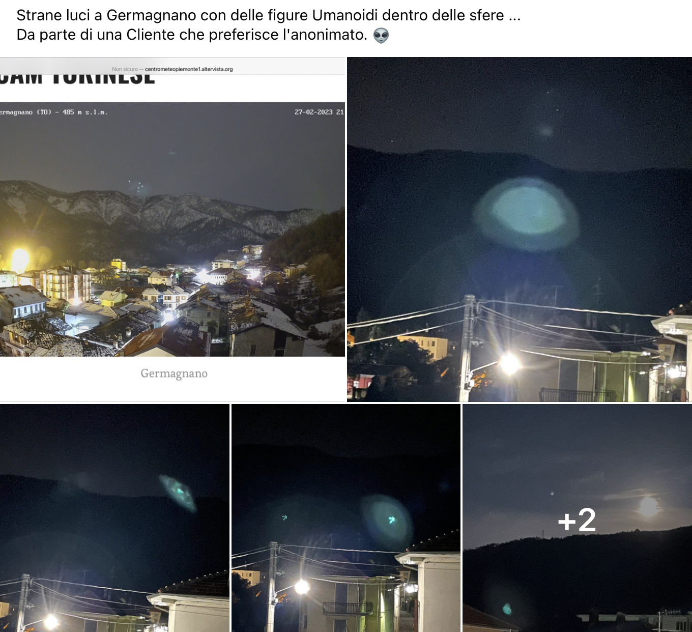 “Strane luci a Germagnano con delle figure Umanoidi dentro delle sfere. Da parte di una Cliente che preferisce l’anonimato” scrive l’autore del post. Alieni? Ufo? Presenze soprannaturali? Qualcuno fa dell’ironia: “Io abito a Germagnano, ma non ho visto nulla. Comunque iniziare un’invasione partendo dal buco del c... del mondo non è segno di intelligenza superiore”.