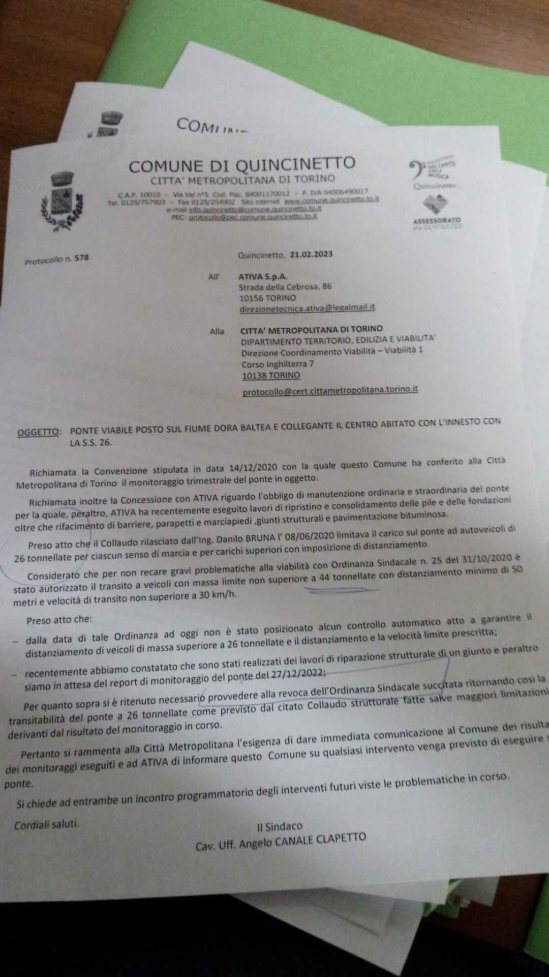 Il ponte era già stato oggetto di lavori di “messa in sicurezza sismica” appaltati da Ativa (la società che gestisce l’autostrada), in quanto uno dei tralicci risultava ammalorato. Per consentire quei lavori la portata massima era scesa fino alle 3, 5 tonnellate. Tutto successe all’improvviso e solo perchè il sindaco Angelo Canale Clapetto, il 13 agosto 2018, cioè il giorno prima del crollo del ponte Morandi di Genova, aveva inviato una sollecitazione al Prefetto di Torino denunciando lo stato di pericolo e chiedendo di intervenire per la sua sistemazione.