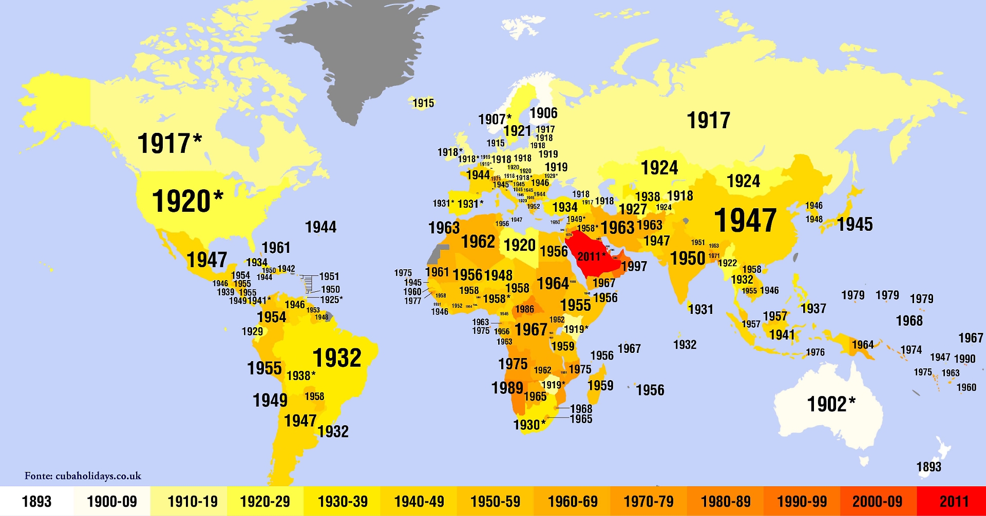 1963 Anche le donne dell’Iran, Kenia, Libia e Malesia ottengono il voto.