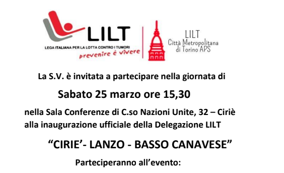 La Lilt mette radici anche a Ciriè. Sabato prossimo, 25 marzo, verrà inaugurata la delegazione cittadina che avrà sede in Corso Nazioni Unite 32 nella palazzina delle associazioni.