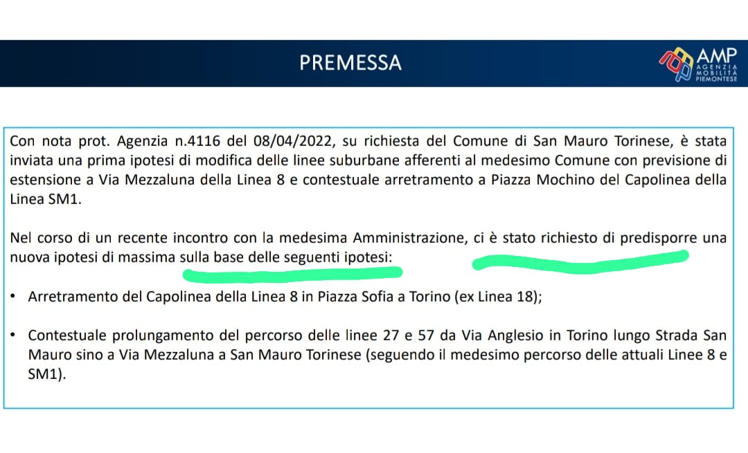 "Nel corso di un recente incontro con la medesima amministrazione - si legge ancora - ci è stato richiesto di predisporre una nuova ipotesi di massima sulla base delle seguenti ipotesi: arretramento del capolinea della linea 8 in Piazza Sofia a Torino (ex linea 18), contestuale prolungamento del percorso delle linee 57 e 27 da via Anglesio in Torino lungo Strada San Mauro sino a via Mezzaluna a San Mauro Torinese (seguendo il medesimo percorso delle attuali linea 8 e Sm1)".