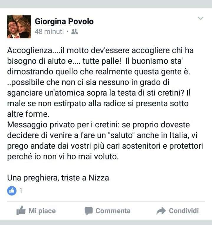 Correva il 2018 e quando l’ASGI (Associazione Studi Giuridici sull’immigrazione) ne venne a conoscenza si rivolse all’avvocato Alberto Guarisio per querelarla. Era tutto scritto lì, nero su bianco, sul profilo facebook della neo assessora della Lega Giorgia Povolo, a cui, ironia della vita, erano appena state assegnate dal sindaco Stefano Sertoli le deleghe “alle politiche sociali e giovanili e le pari opportunità”....
