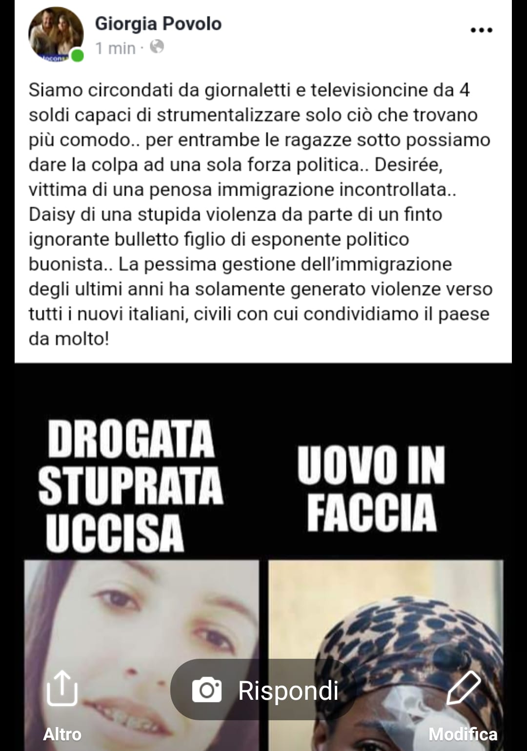 Per ricominciare con un post contro i marocchini (ce ne ritroviamo uno presidente), un altro contro i giornali e le tv definite “giornaletti, da quattro soldi” e su “Desirée vittima di una immigrazione incontrollata”.