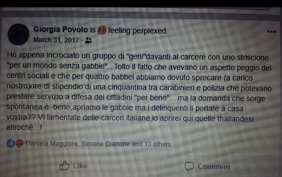 Contro i galeotti: “Ho appena incrociato un gruppo di geni davanti al carcere con uno striscione per un mondo senza gabbia. Tolto il fatto che avevano un aspetto peggio dei centri sociali e che per quattro babbei abbiamo dovuto sprecare (a carico nostro) ore di stipendio di una cinquantina tra carabinieri e polizia che dovevano prestare servizio a difesa dei cittadini per bene, ma la domanda che sorge spontanea è: bene, apriamo le gabbie, ma i delinquenti li portate a casa vostra??? Vi lamentate delle carceri italiane, io aprirei qui quelle thailandesi altroché…!”.