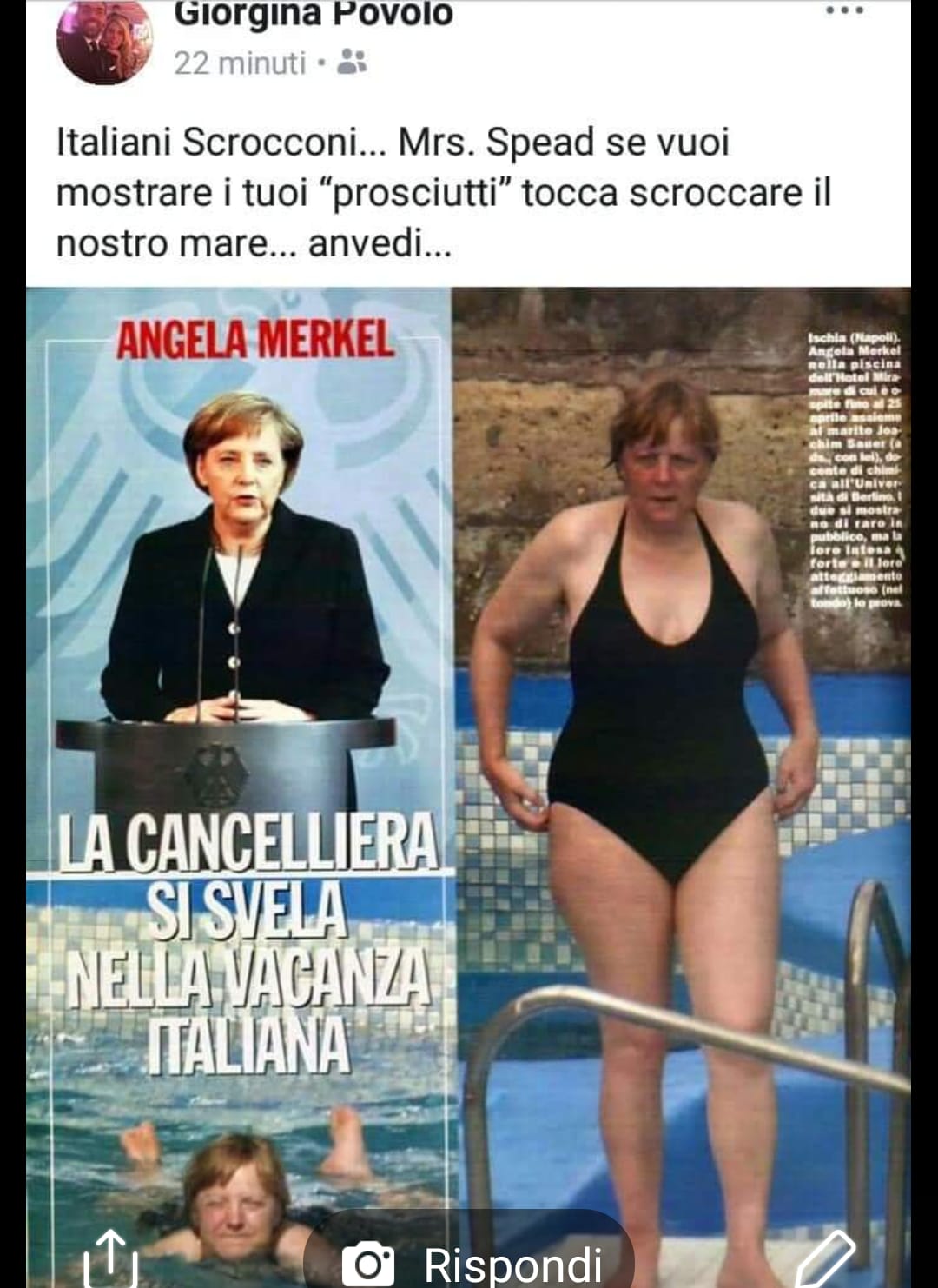 E si ricomincia dai rom: “Una festa speciale, un giorno particolare per festeggiare un popolo denigrato e bisognoso di misericordia…. bla bla bla e sti cazzi…. Un insulto alle persone per bene e ai lavoratori onesti…. festeggiano un popolo che proprio come dice la parola nomade dovrebbe muoversi continuamente, il vero risultato è che le zecche stanziano in campi abusivi dalla giovane età alla vecchiaia, vergogna!”. Poi contro la Merkel. “Italiani scrocconi. Mr Spead se vuoi mostrare i tuoi prosciutti tocca scroccare il nostro mare…. anvedi…“.