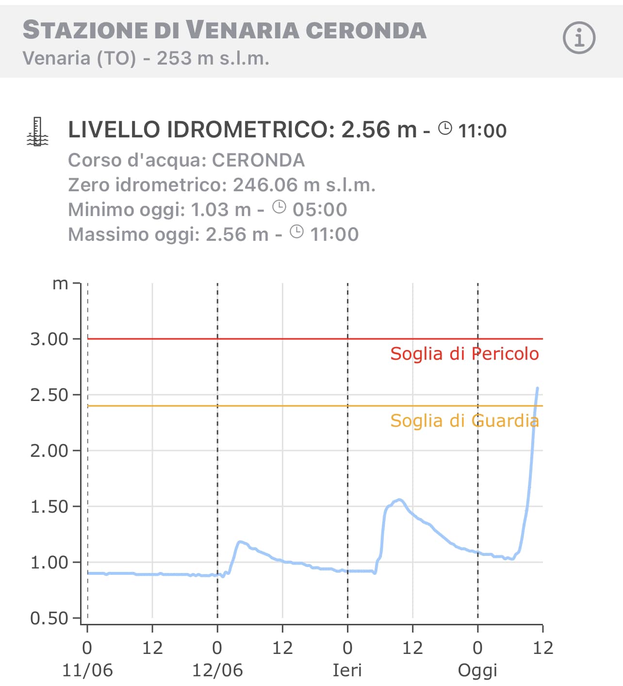 Questa mattina, intorno alle 11, è stata superata la soglia di guardia del torrente Ceronda a Venaria Reale con un’altezza massima di 2.56m rispetto allo zero idrometrico.