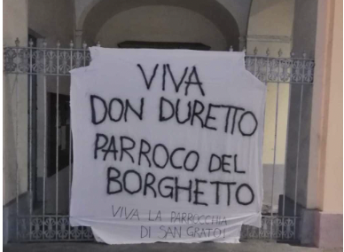 Una petizione inviata al Vescovo per salvare il soldato Don Giuseppe Duretto. L'hanno sottoscritta in tanti al Borghetto ma anche oltre. Numerose associazioni (dai Tuchini ai Croati a I Croass (corvi) del Borghet, passando dalla San Vincenzo) e un mucchio di cittadini e fedeli con le lacrime agli occhi. Il Vescovo avrebbe già risposto. Ha detto a tutti di stare tranquilli, ma la "tranquillità" è davvero un'altra cosa. Deboli e impotenti di fronte alle gerarchie qualcuno ha così pensato bene di affiggere uno striscione davanti al portone. E' rimasto attaccato poche ore. Si leggeva (e non si legge più) "Viva Don Duretto parroco del Borghetto".