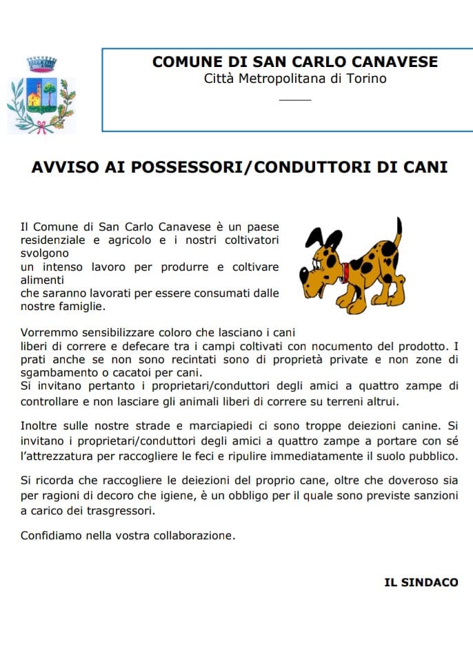 "Il Comune di San Carlo Canavese è un paese residenziale e agricolo e i nostri coltivatori svolgono un intenso lavoro per produrre e coltivare alimenti che saranno lavorati per essere consumati dalle nostre famiglie" si legge nell'avviso.
