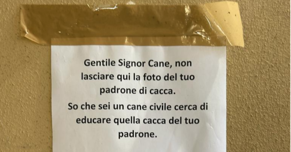 “Gentile Signor Cane, non lasciare qui la foto del tuo padrone di cacca. So che sei un cane civile cerca di educare quella cacca del tuo padrone. Grazie”.