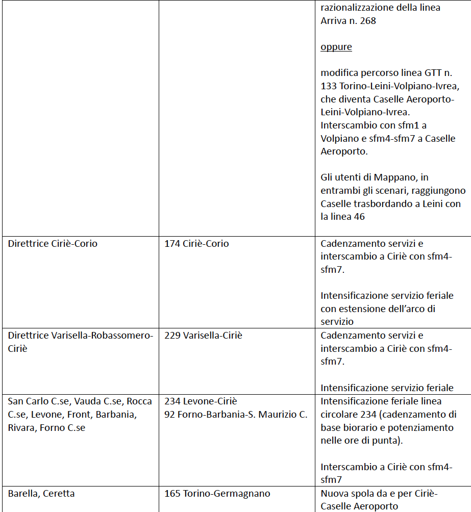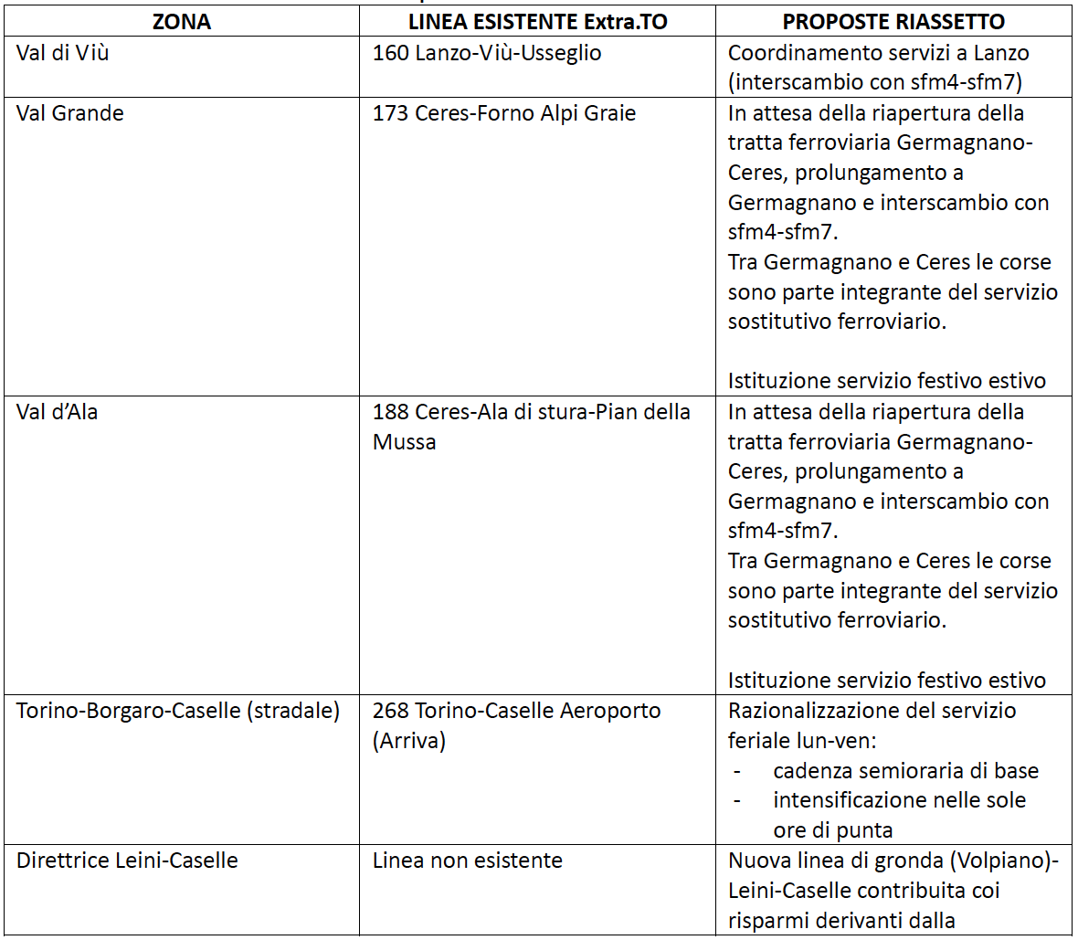Su alcune tratte (quali le alte valli di Lanzo, le valli Ceronda e Casternone) è indispensabile una implementazione del servizio, altrimenti inadeguato rispetto alle possibilità di coordinamento con il Servizio Ferroviario Metropolitano; altri territori (Leinì, Malanghero, Mappano) necessitano di una riprogrammazione dei collegamenti afferenti; su alcune tratte, infine, come la Torino-Borgaro-Caselle, risulta infine doverosa una riorganizzazione alla luce della “concorrenza positiva” del treno, anche per liberare risorse utili agli altri obiettivi di riassetto.