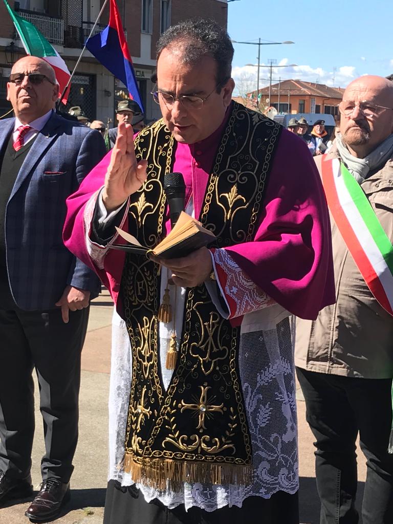 Don Maurizio Morella. Dietro di lui il consigliere regionale Gianluca Gavazza e il sindaco Massimo Rozzino