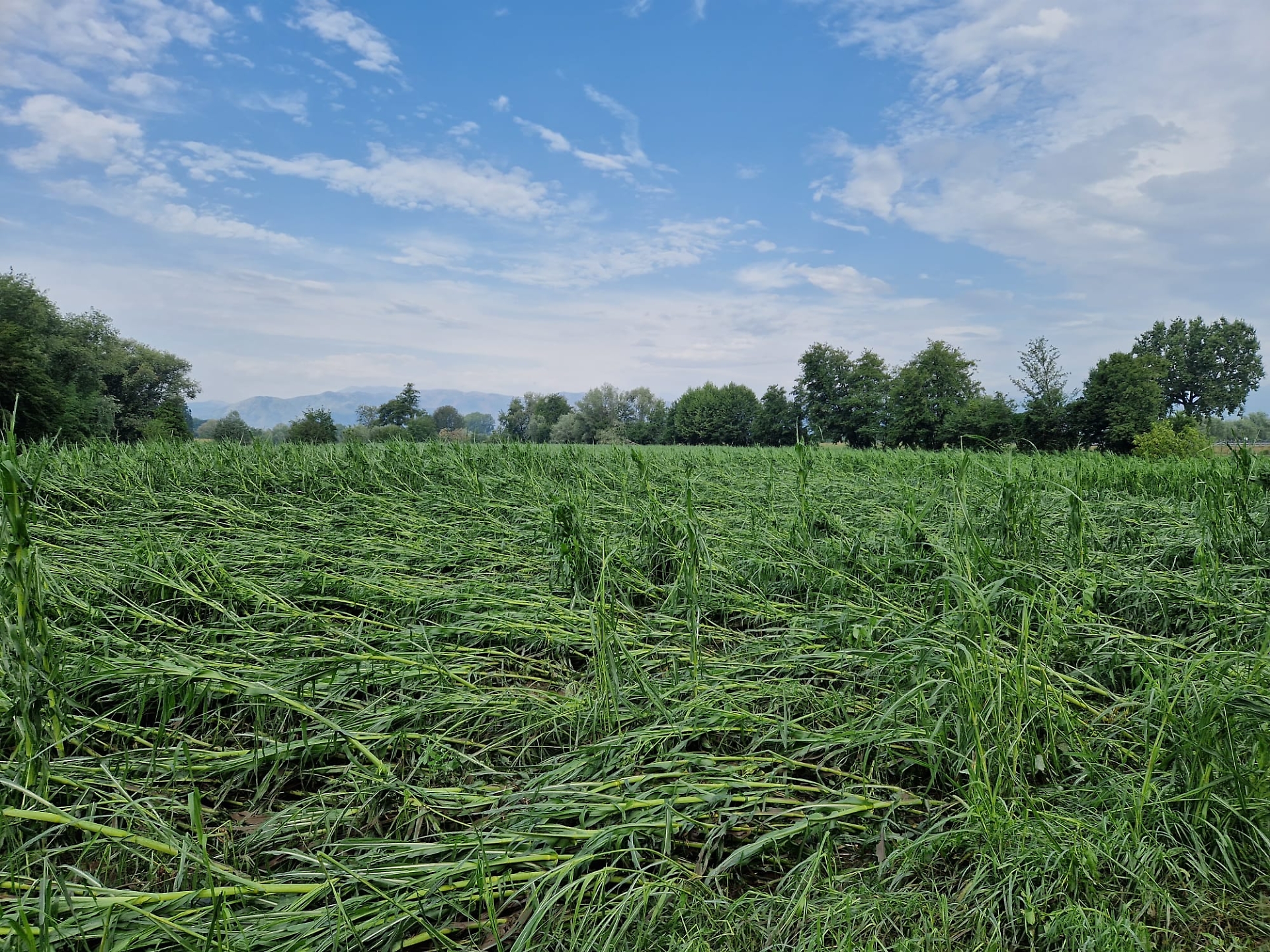 La coltura più danneggiata è il mais che è ormai in fase di raccolta per la destinazione a insilati. Interi campi sono stati abbattuti dal forte vento e schiacciati dalla grandinata. Azzerati tutti i cosiddetti secondi raccolti che vengono destinati al consumo bovino e che hanno piante ancora in crescita, ma è andato distrutto anche il 50% dei primi raccolti, la parte più importante dell’annata agricola. Molti agricoltori avevano programmato questo raccolto proprio questa settimana. Ma anche la trebbiatura tardoestiva delle sole pannocchie è a rischio visto che queste sono finite tutte a terra e rischiano di marcire.