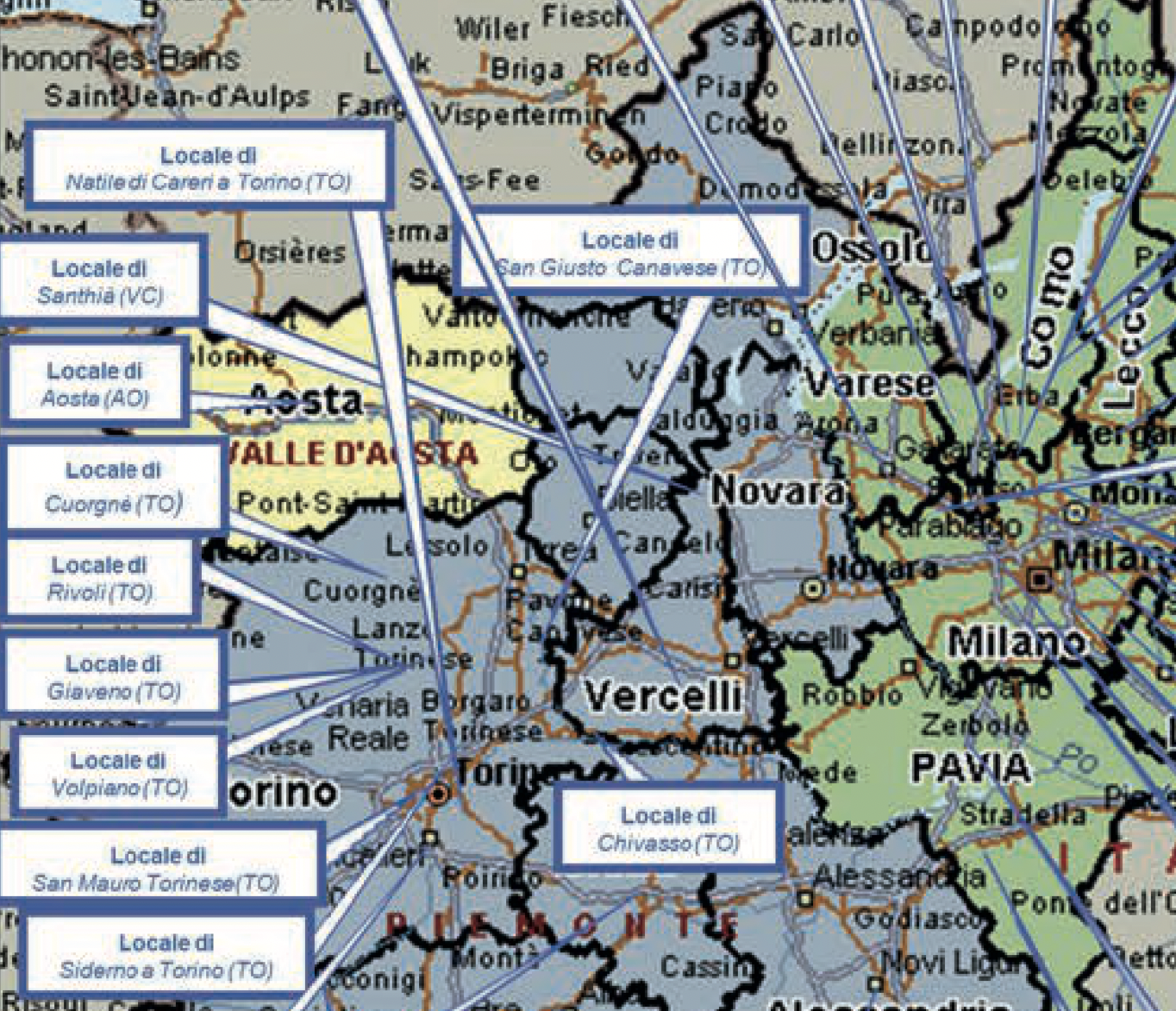 Ad Ivrea, un recente provvedimento cautelare emesso dal Tribunale di Torino nei confronti di esponenti della cosca ALVARO di Sinopoli (RC) ha individuato il locale di Ivrea.