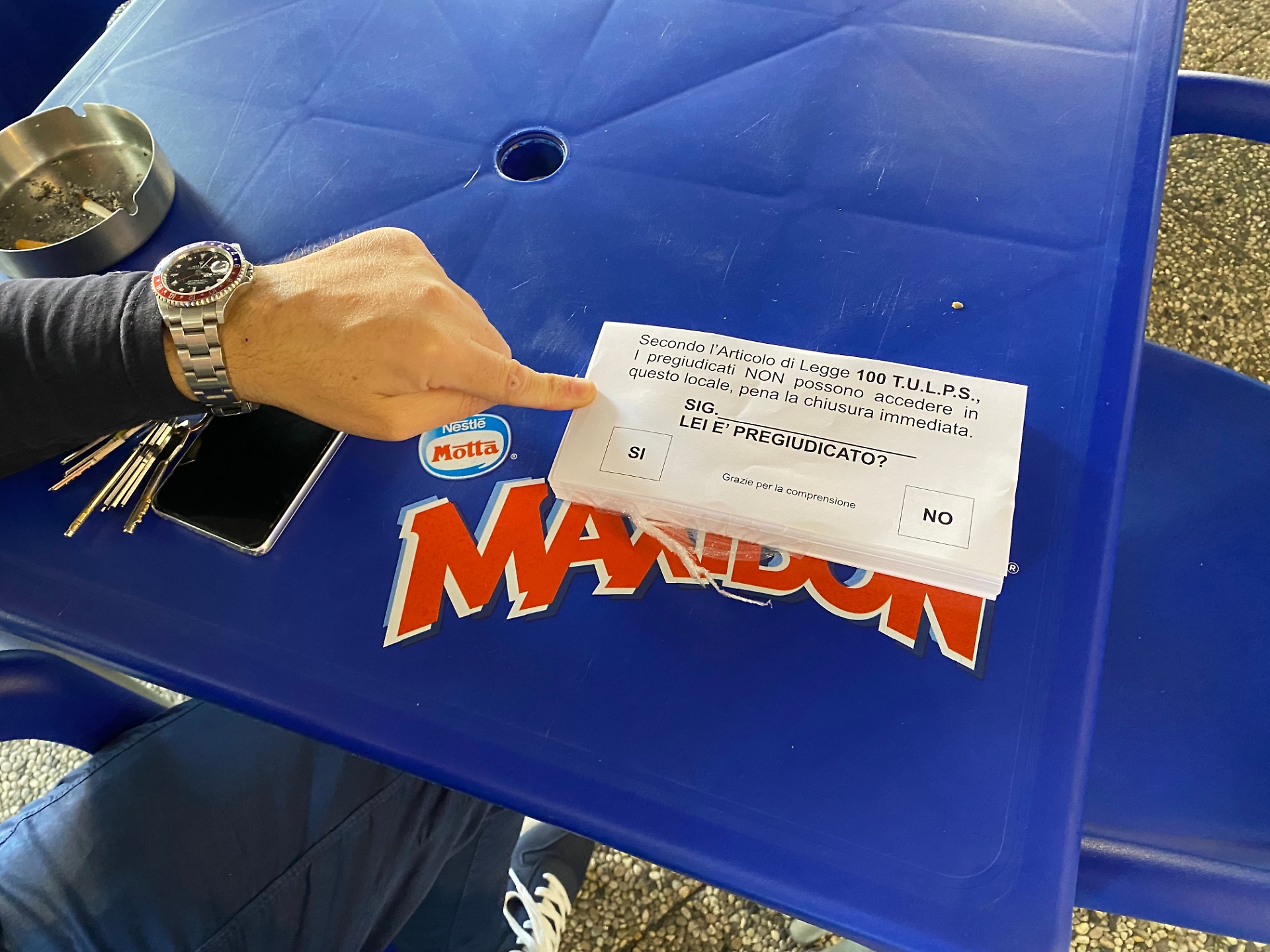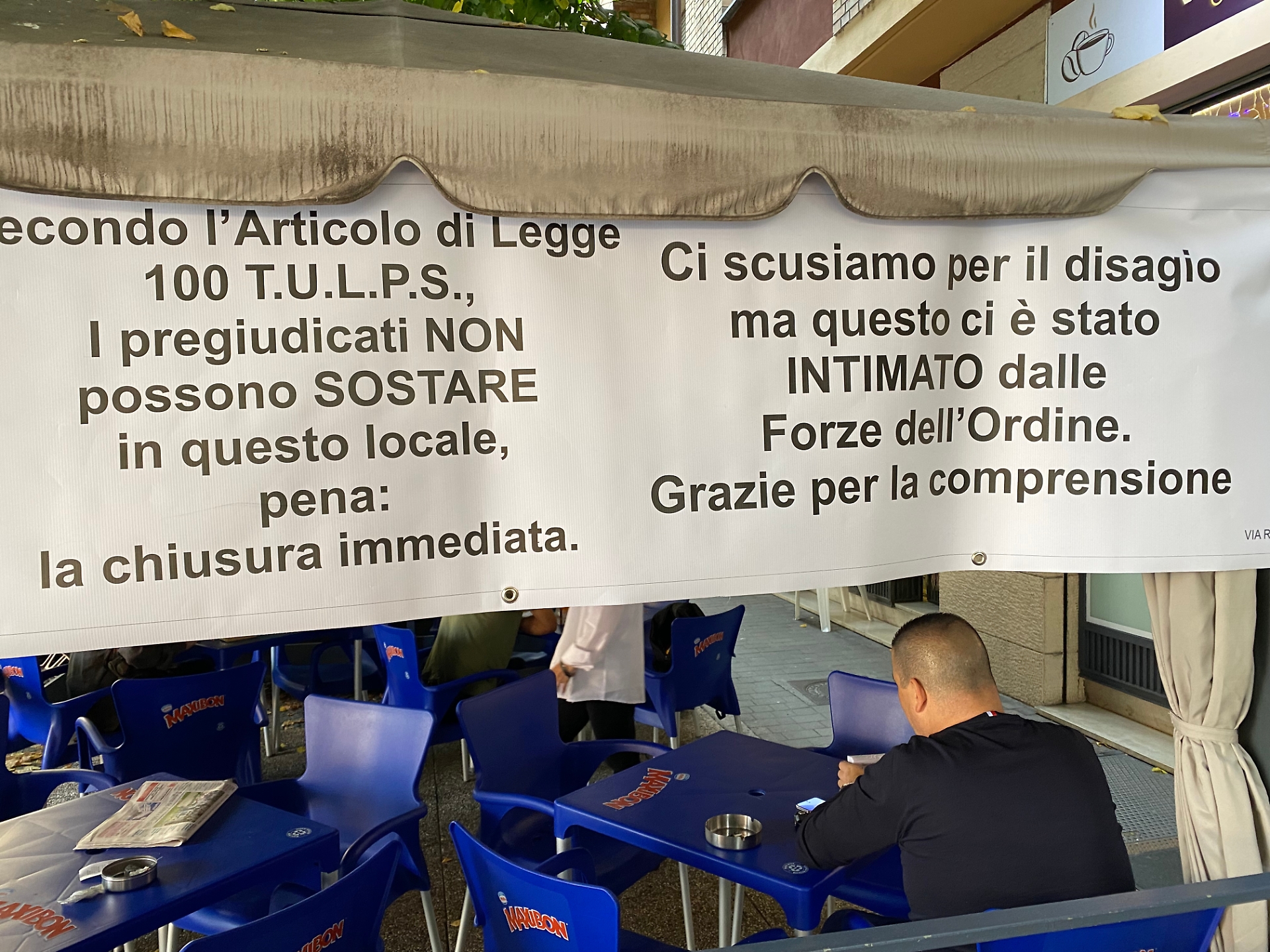“I pregiudicati non possono sostare in questo locale, pena la chiusura immediata. Ci scusiamo per il disagio ma questo ci è stato intimitato dalle forze dell’ordine. Grazie per la comprensione”.