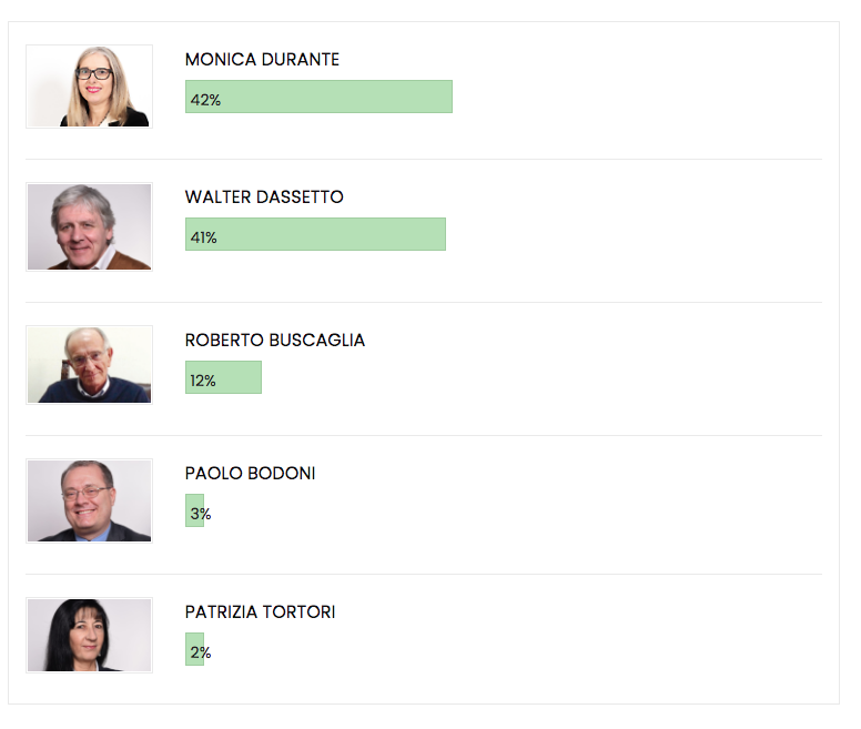 Per un solo punto percentuale arriva secondo Walter Dassetto, una candidatura che, seppur senza alcuna conferma, circolava in paese con insistenza. Per lui ha votato il 41% dei partecipanti al sondaggio