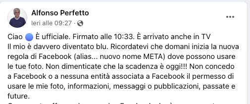 Il mio è davvero diventato blu. Ricordatevi che domani inizia la nuova regola di Facebook (alias... nuovo nome META) dove possono usare le tue foto. Non dimenticate che la scadenza è oggi!!! Non concedo a Facebook o a nessuna entità associata a Facebook il permesso di usare le mie foto, informazioni, messaggi o pubblicazioni, passate e future.