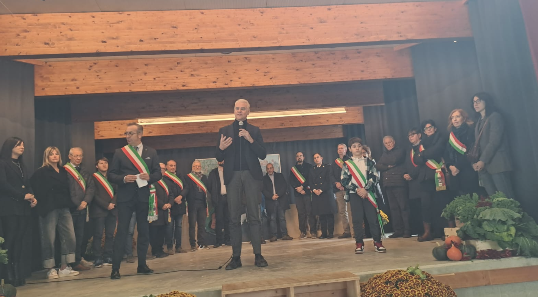 Molte le autorità presenti alla Fiera; sul palco, il sindaco di Rivalba Davide Rosso e il ministro Paolo Zangrillo