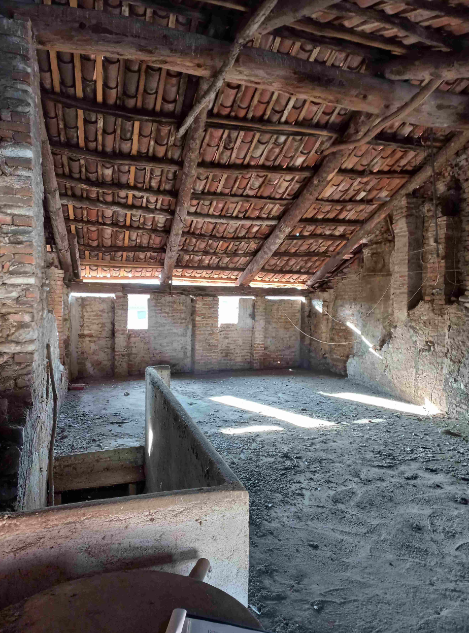 All’ampio locale unico del sottotetto si accede con una scala in legno dal soggiorno. Le aperture esistenti sui tre lati sono aperte, il pavimento è in battuto di cemento e la struttura della copertura a vista.