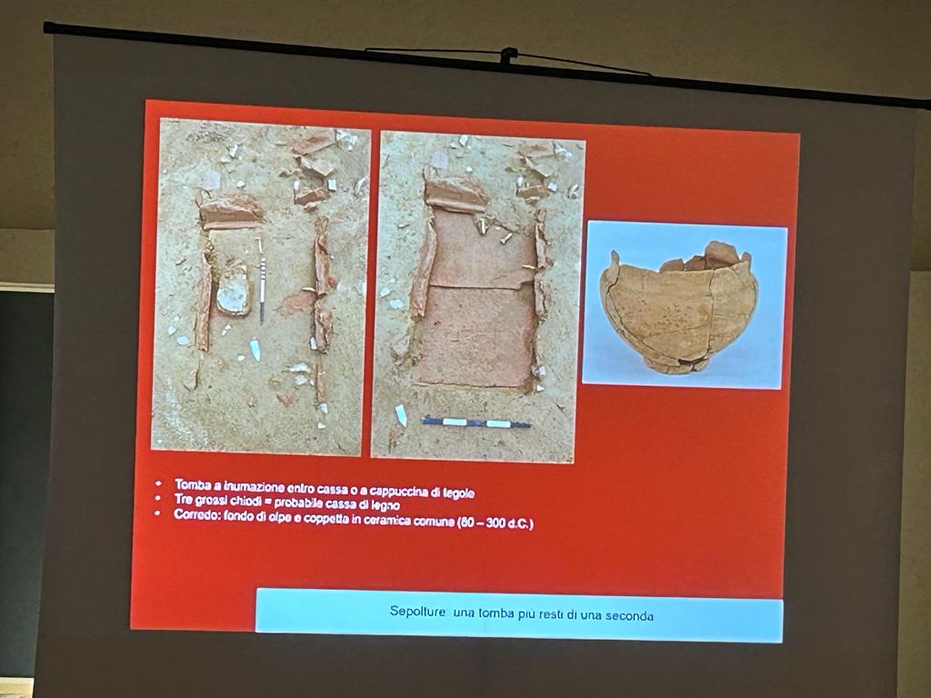 Il una c'erano tre grossi chiodi, probabilmente appartenuti alla cassa di legno, e il corredo funebre costituito da una brocca e una coppetta in ceramica comune, diffusa tra la fine del primo secolo e i primi decenni del terzo secolo. Tutt'intorno, fango, limo, proprio a dimostrazione che quell'area era stata gravemente compromessa già in passato da un'alluvione.
