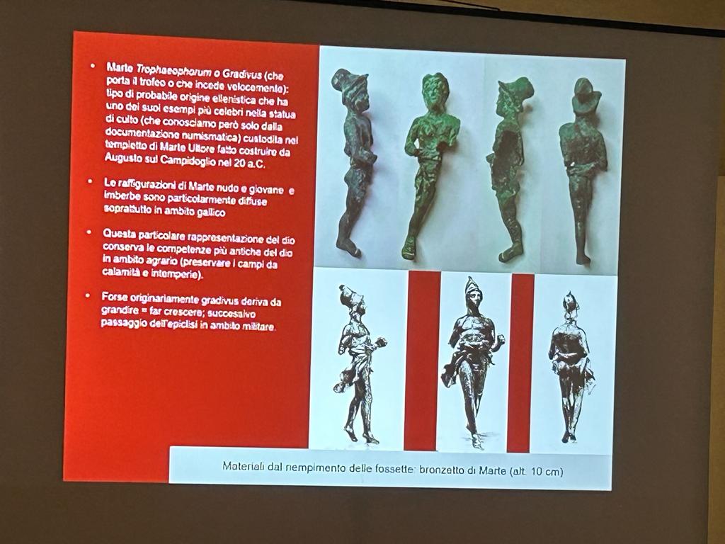 In una fossetta di sepoltura vicina a quella in cui sono state trovate le monete, è stato rinvenuto uno tra i reperti più importanti: una statuetta di bronzo, alta circa 10 centimetri, raffigurante il dio Marte "Gradivus", e cioè "colui che va" sottintendendo in battaglia. Nonostante manchi una gamba, è chiara la posizione essendo il piede superstite nella posa leggera che ricorda una danza.