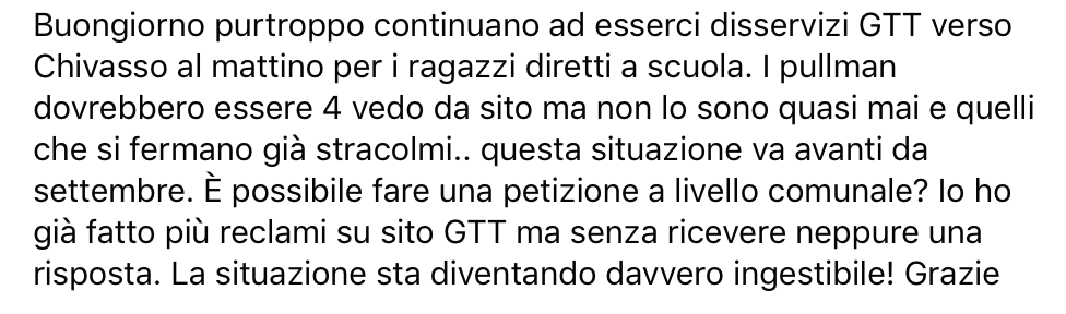 “Buongiorno - scrive una cittadina - purtroppo continuano ad esserci disservizi GTT verso Chivasso al mattino per i ragazzi diretti a scuola. I pullman dovrebbero essere 4 vedo dal sito ma non lo sono quasi mai e quelli che si fermano già stracolmi... questa situazione va avanti da settembre. È possibile fare una petizione a livello comunale? Io ho già fatto più reclami sul sito GTT ma senza ricevere neppure una risposta. La situazione sta diventando davvero ingestibile! Grazie”, “Così tutte le mattine - aggiunge un’altra - anche se prendi quello delle 7.20”.