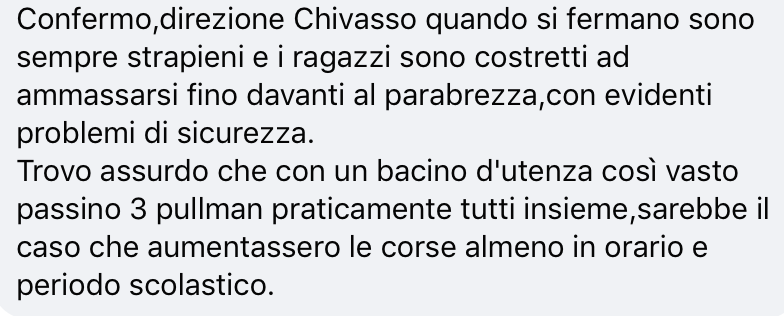 “Confermo, - spiega un cittadino -direzione Chivasso quando si fermano sono sempre strapieni e i ragazzi sono costretti ad ammassarsi fino davanti al parabrezza,con evidenti problemi di sicurezza. Trovo assurdo che con un bacino d’utenza così vasto passino 3 pullman praticamente tutti insieme, sarebbe il caso che aumentassero le corse almeno in orario e periodo scolastico”.