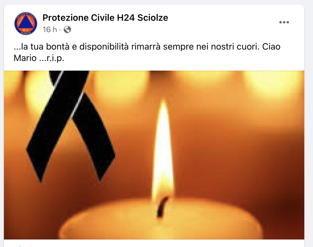 A dare la notizia è stata proprio la Protezione Civile sciolzese: “oggi purtroppo è venuto a mancare il nostro amico e compagno di volontariato Mario Ferrero - pubblicano via social - riposa in pace, la tua bontà e disponibilità rimarrà per sempre nei nostri cuori”.