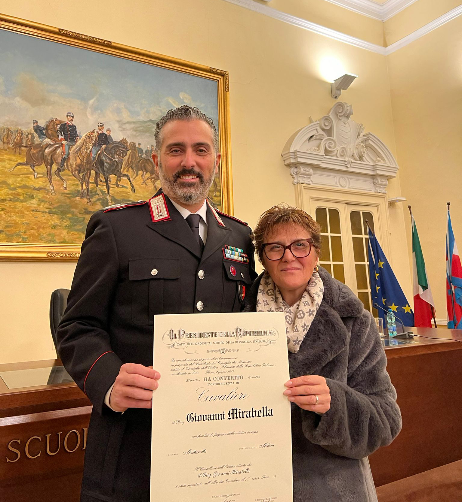 Presente alla cerimonia l’assessore alla Legalità di Chivasso, Gianluca Vitale: “È stato un piacere e un onore accompagnare l'amico e collega Giovanni Mirabella come rappresentante della città di Chivasso alla cerimonia con cui è stato insignito del titolo di Cavaliere della Repubblica”.