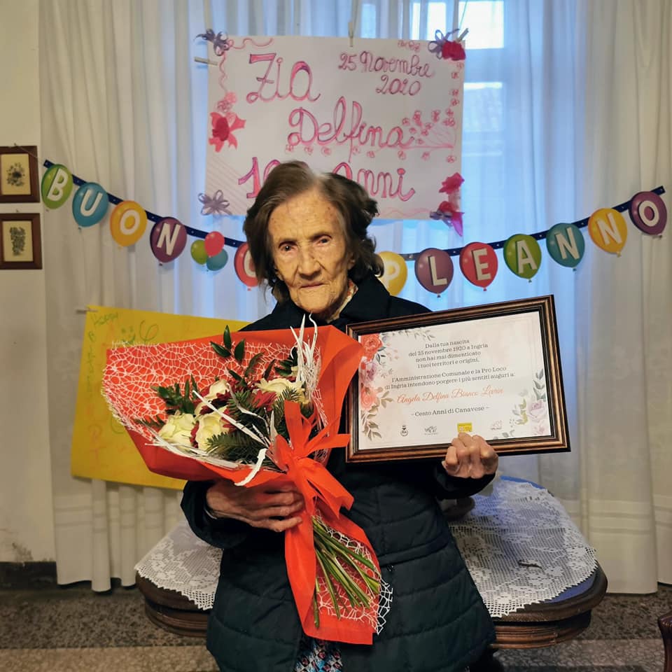 “Era il 25 novembre del 1920 quando Delfina Angela Bianco Levrin venne alla luce a Ingria in Val Soana: circa due anni fa durante la pandemia ci eravamo ripromessi di rivederci con più serenità e sorrisi, così è stato oggi!”.