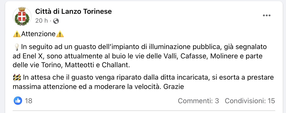 “Attenzione. In seguito ad un guasto dell’impianto di illuminazione pubblica, già segnalato ad Enel, sono attualmente al buio le vie delle Valli, Cafasse, Molinere e parte delle vie Torino, Matteotti e Challant” hanno tempestivamente comunicato dall’amministrazione lanzese via social.