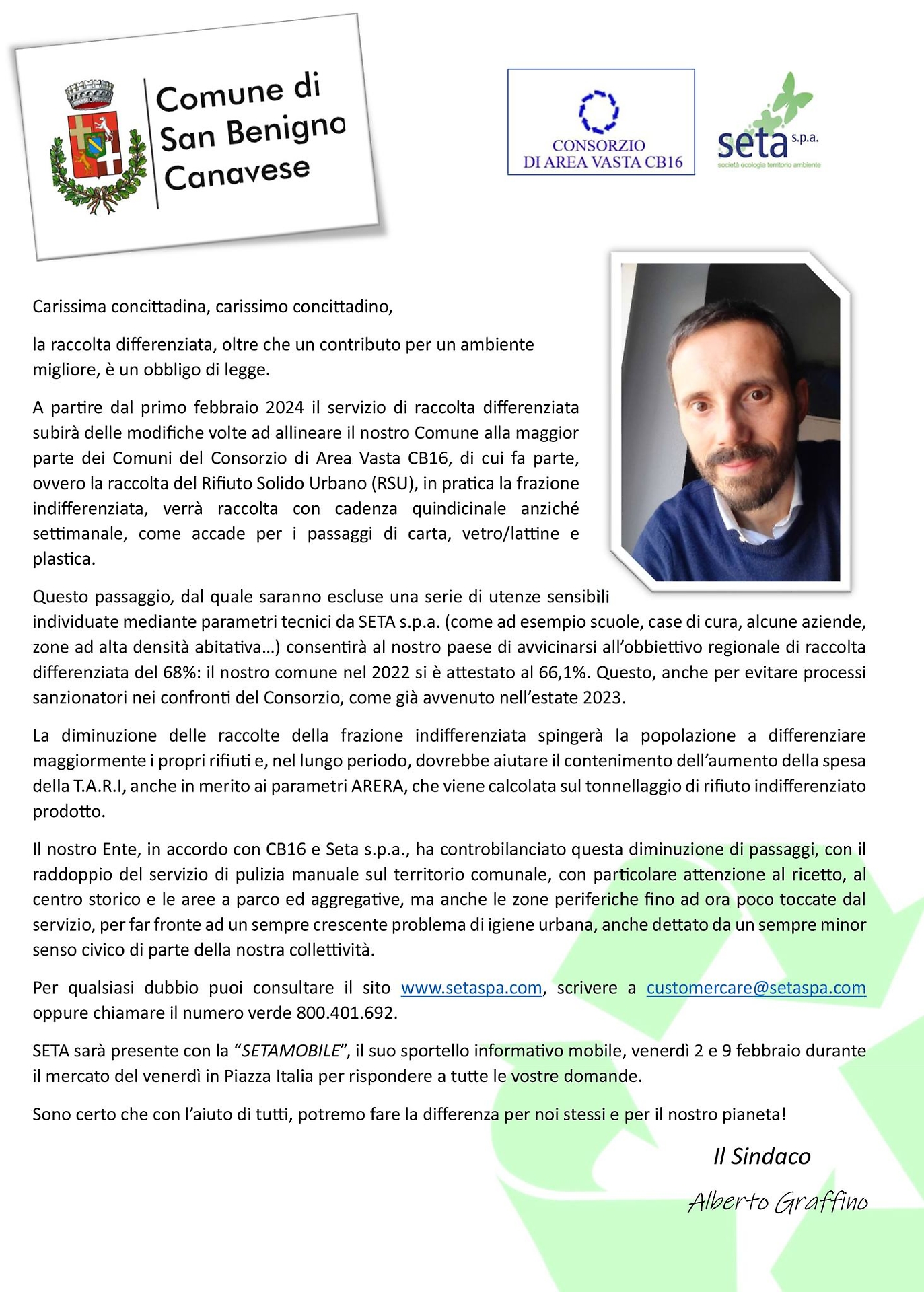 A partire dal primo febbraio 2024 il servizio di raccolta differenziata subirà delle modifiche volte ad allineare il nostro Comune alla maggior parte dei Comuni del Consorzio di Area Vasta CB16, di cui fa parte, ovvero la raccolta del Rifiuto Solido Urbano (RSU), in pratica la frazione indifferenziata, verrà raccolta con cadenza quindicinale anziché settimanale, come accade per i passaggi di carta, vetro/lattine e plastica. Questo passaggio, dal quale saranno escluse una serie di utenze sensibili individuate mediante parametri tecnici da SETA spa (come ad esempio scuole, case di cura, alcune aziende, zone ad alta densità abitativa…) consentirà al nostro paese di avvicinarsi all’obbiettivo regionale di raccolta differenziata del 68%: il nostro comune nel 2022 si è attestato al 66,1%. Questo, anche per evitare processi sanzionatori nei confronti del Consorzio, come già avvenuto nell’estate 2023. La diminuzione delle raccolte della frazione indifferenziata spingerà la popolazione a differenziare maggiormente i propri rifiuti e, nel lungo periodo, dovrebbe aiutare il contenimento dell’aumento della spesa della T.A.R.I, anche in merito ai parametri ARERA, che viene calcolata sul tonnellaggio di rifiuto indifferenziato prodotto. Il nostro Ente, in accordo con CB16 e SETA spa., ha controbilanciato questa diminuzione di passaggi, con il raddoppio del servizio di pulizia manuale sul territorio comunale, con particolare attenzione al ricetto, al centro storico e le aree a parco ed aggregative, ma anche le zone periferiche fino ad ora poco toccate dal servizio, per far fronte ad un sempre crescente problema di igiene urbana, anche dettato da un sempre minor senso civico di parte della nostra collettività. Per qualsiasi dubbio puoi consultare il sito www.setaspa.com, scrivere a customercare@setaspa.com oppure chiamare il numero verde 800.401.692.