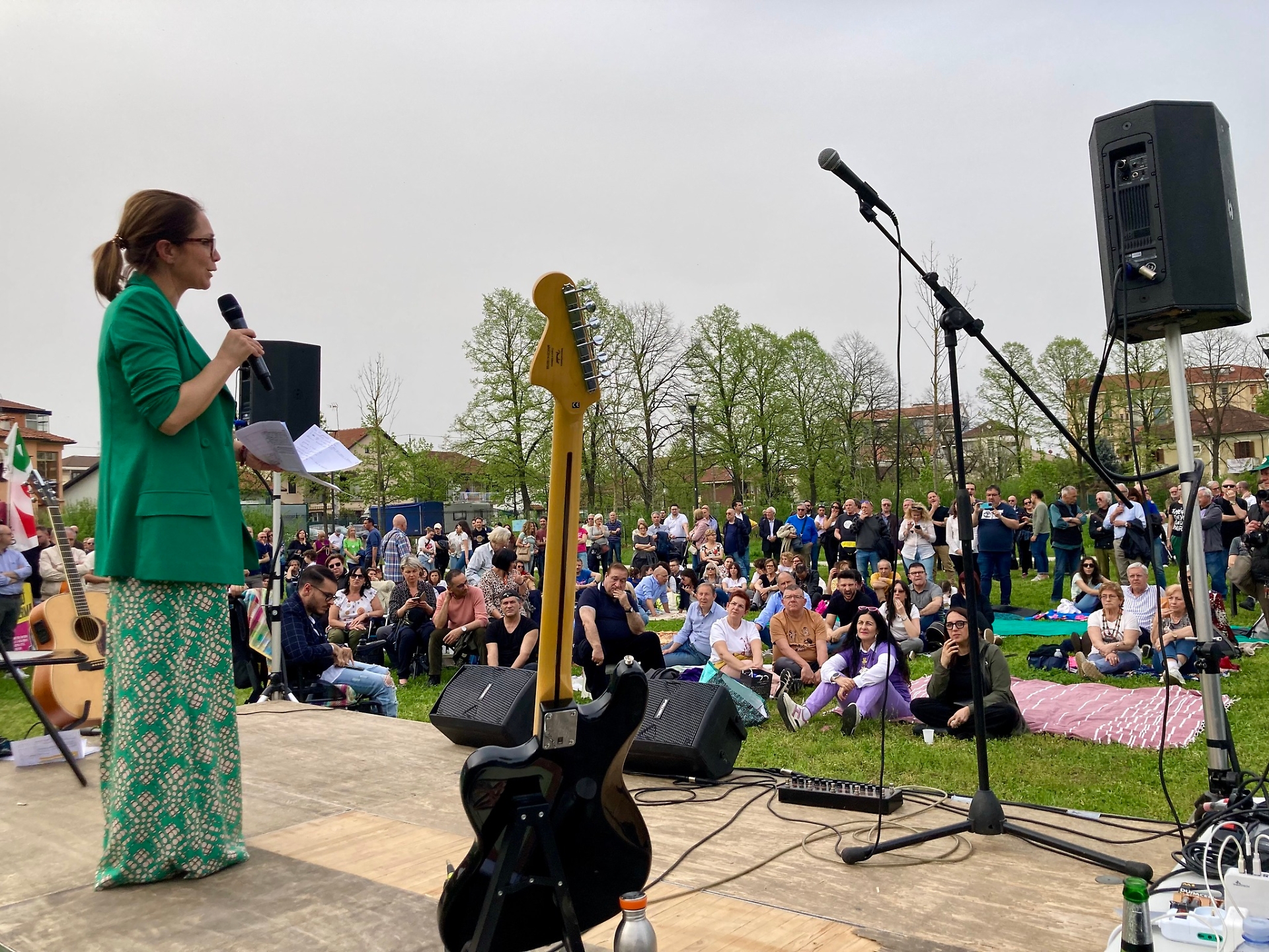E' il "Piastra Day" organizzato al parco Nilde Iotti nel pomeriggio di domenica 7 aprile, la sindaca parla dal palco allestito per realizzare una piccola area concerto in cui si è esibita anche la band torinese dei Perturbazione.