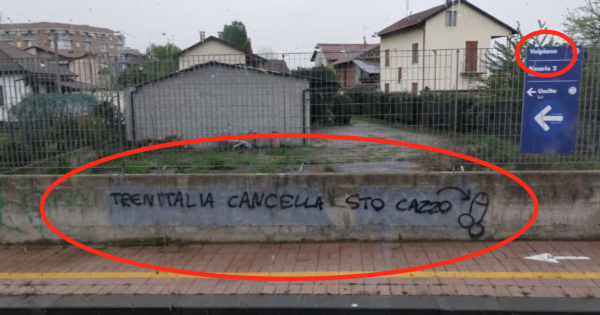 Stazione di Volpiano, dove l'arte incontra la frustrazione dei pendolari! Un messaggio goliardico è comparso da un p' sui muri: "Trenitalia cancella sto c***o" Chiunque sia stato, ha sicuramente catturato l'umore di tutti quelli che aspettano il treno lì ogni giorno. Tutte le mattine i viaggiatori arrivano in stazione e si ritrovano davanti quella scritta che sintetizza al meglio la rabbia dei cittadini. Ritardi? Cancellazioni? I pendolari hanno trovato un modo per farsi sentire!