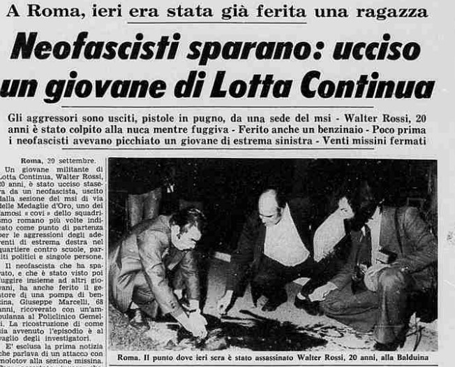 Il blindato della polizia inizia a scendere lentamente per Via Medaglie D'oro, nascondendo, più o meno volutamente, due neofascisti romani, Alessandro Alibrandi e Cristiano Fioravanti. Improvvisamente, i due attraversano la strada e puntano le loro pistole verso i "compagni". Walter Rossi, 20 anni da compiere, viene colpito da una pallottola alla nuca e muore sul colpo. Ai militanti presenti insieme a lui la polizia spiega di non poter far nulla poiché "non hanno a disposizione neanche la radio".