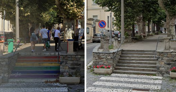 Nell’estate di tre anni fa, su iniziativa del fantasioso consigliere delegato Stefano Pegoraro, la scalinata, i pilastrini del parapetto e le panchine erano stati dipinti in tinte vistose per vivacizzare il centro del paese lanciando allo stesso tempo messaggi di inclusione, non violenza, solidarietà fra individui e gruppi sociali. Le alzate dei gradini avevano i colori della bandiera arcobaleno, che negli ultimi anni è stata identificata come propria del movimento LGBT ma che in realtà era nata e si era diffusa come stendardo delle organizzazioni pacifiste. I colori delle panchine e dei pilastrini richiamavano ciascuno un tema al centro delle battaglie civili: il rosso è diventato il simbolo delle donne vittime di violenza; il rosa quello delle battaglie contro il tumore al seno; il verde quello della difesa dell’ambiente. Altri simbolismi sono meno noti ma altrettanto importanti: il viola è associato all’Alzheimer, il giallo ai suicidi, il blu al bullismo, l’arancione alla fame nel mondo. Il bianco è da sempre simbolo di purezza e di innocenza e quindi dell’infanzia. A completare il messaggio, su ciascuna panchina era stata riportata una frase legata al tema che la riguardava.