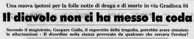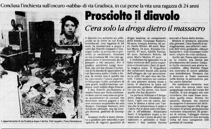 Andrea Bascheri, il sostituto procuratore incaricato delle indagini, non è però uomo preda facile di suggestioni del genere. L’autopsia sui cadaveri e le analisi del sangue effettuate a carico di Gaspare rivelano che quella notte i tre avevano in corpo un cocktail di cocaina, allucinogeni ed alcol. In aggiunta, nel doppiofondo di un cassetto del pied-à-terre (che era la casa di Fosca) vengono trovati 50 grammi d’eroina ancora da tagliare del valore, una volta “trattati” e spacciati, di circa 100 milioni di lire: è quella la pista giusta, il diavolo non c’entra niente.