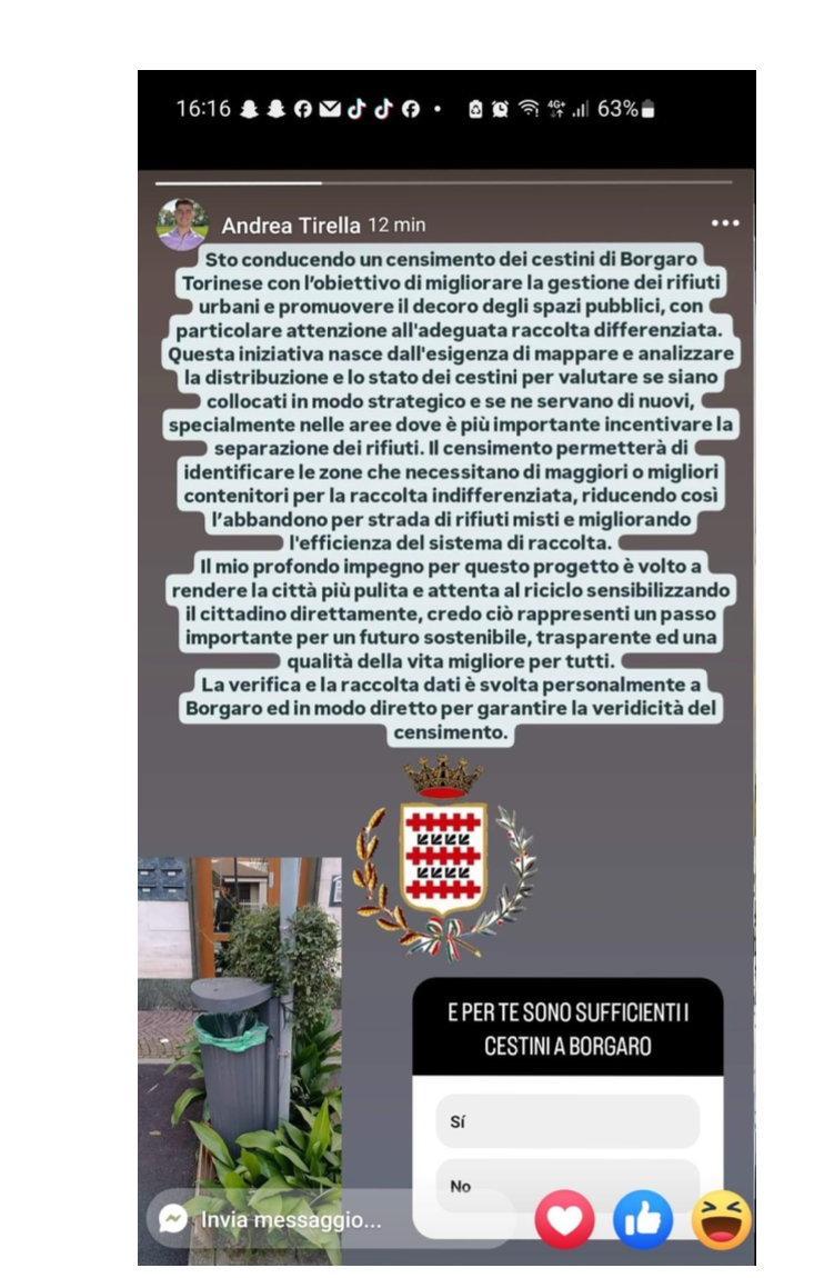 Andrea Tirella, Presidente del Consiglio e delegato allo Sport, annuncia, con parole toccanti, che si sta occupando personalmente di un censimento dei cestini comunali. Un post che dura poco: dieci minuti e… sparisce! Tuttavia, abbastanza perché qualcuno catturi lo schermo e l’ira della minoranza esploda: “Perché si fanno belli con le nostre motivazioni?”